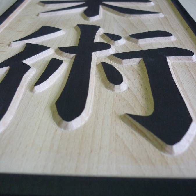 Dřevěná tabulka je přesně vyřezána z buku, povrchově upravená černou barvou, která v sobě vykazuje strukturu tahů štětce. Plasticky vyřezávaná tabulka nesmí chybět v žádném dojo nebo tělocvičně.
